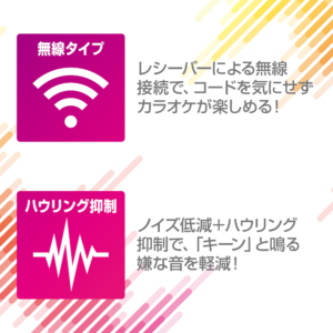 ノイズやハウリングを抑える機能を搭載し、マイク同士やスピーカーに近づけても「キーン」という嫌な異音が発生しにくい設計です。
