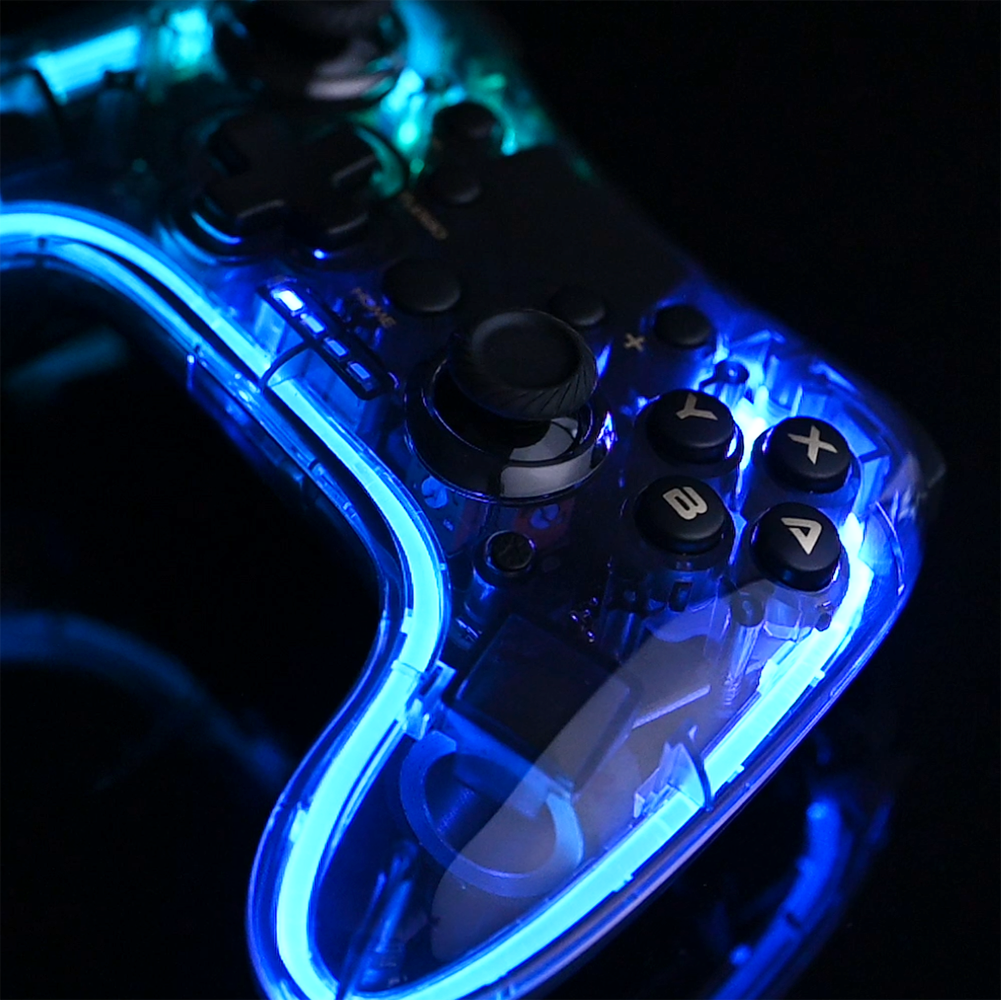 ボディ内部のLEDネオンチューブが、10種類のパターンに変色しながら流れるように発光。ゲームシーンを盛り上げます。ボタン操作で好きな光り方で固定したり、消灯することもできます。