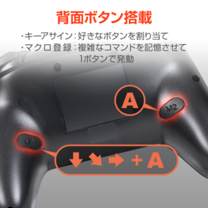 背面には、好きなボタンを割り当てたり複雑なコマンドを登録できるボタンを搭載。FPSや格闘ゲームなどの、複雑な操作をボタンひとつで再現できます。