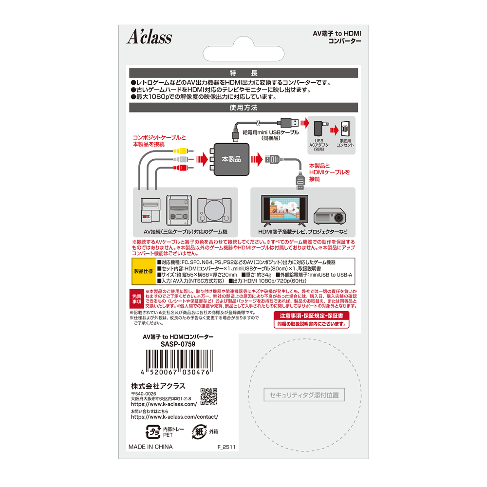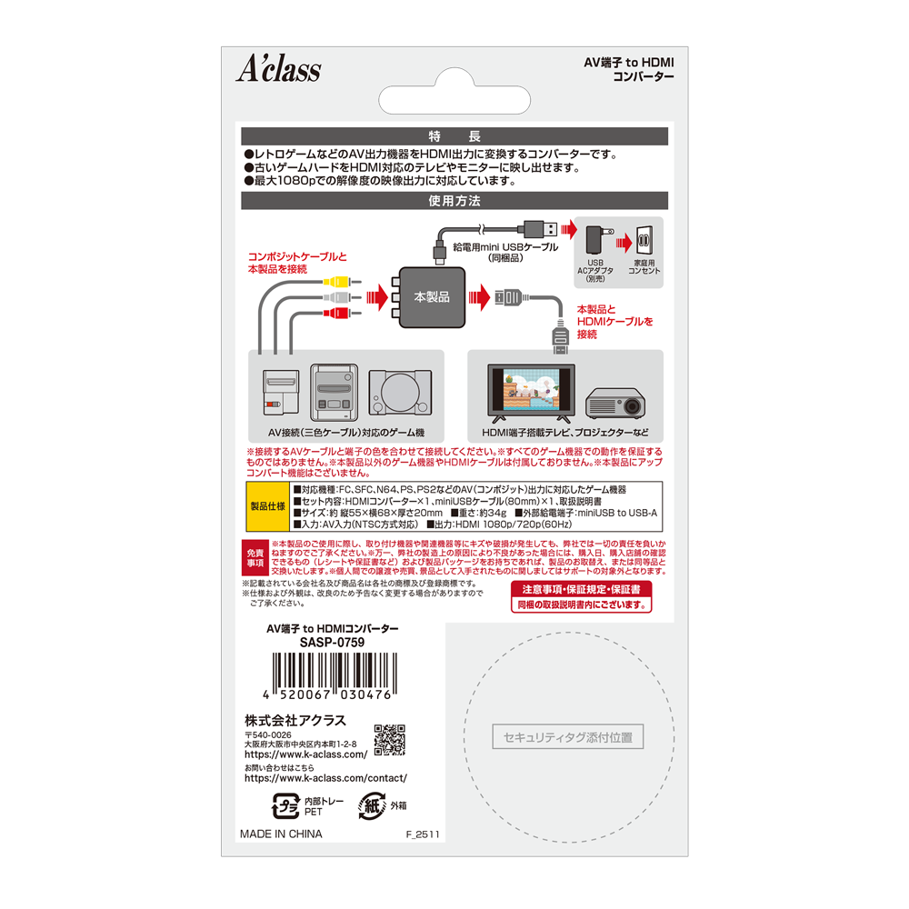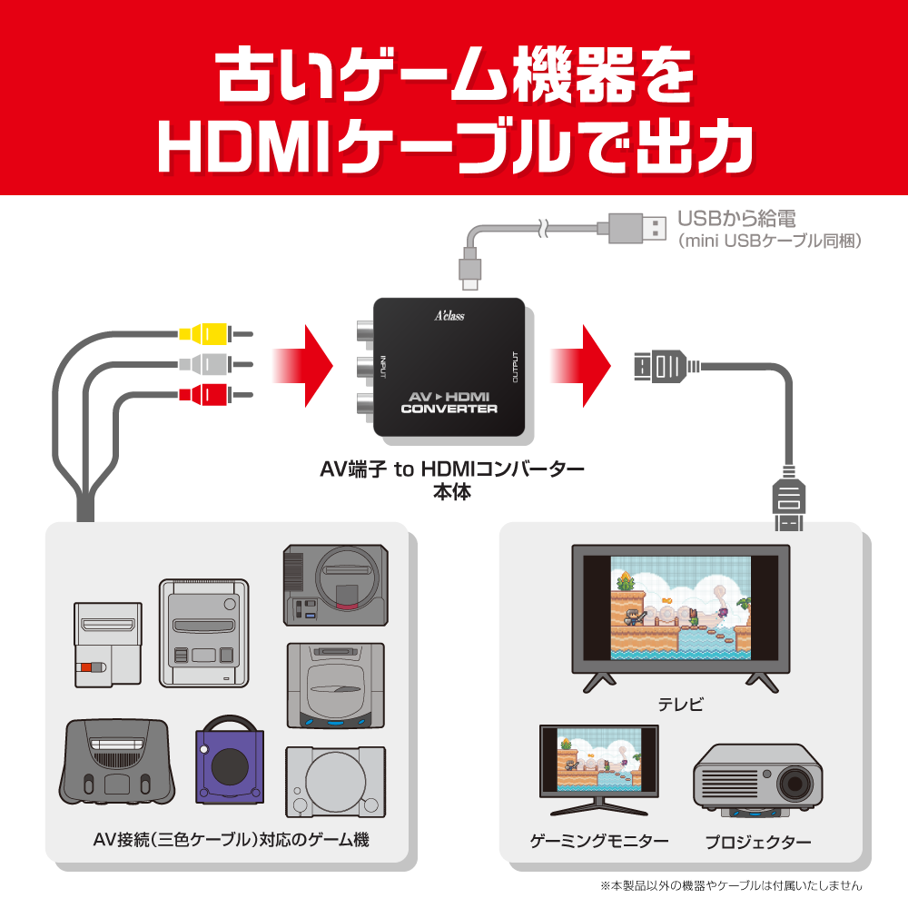 古いゲーム機器やビデオデッキなどのAV出力をHDMIに変換して映像を出力するコンバーターです。AV端子のないテレビやモニターでも、古いの機器の映像を簡単に映し出せます。