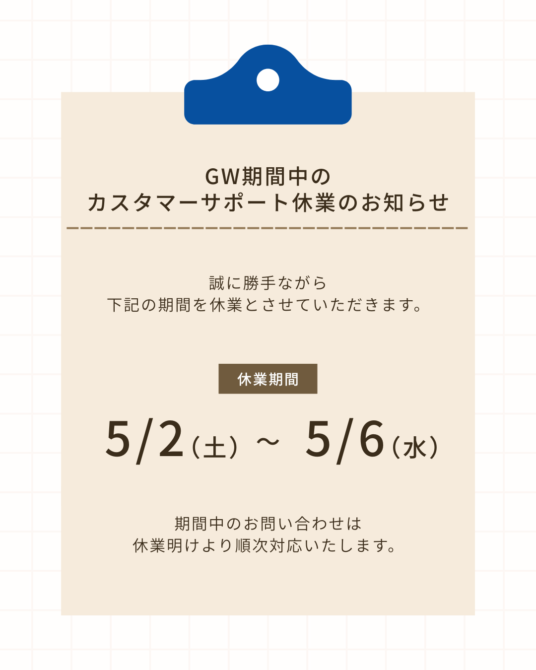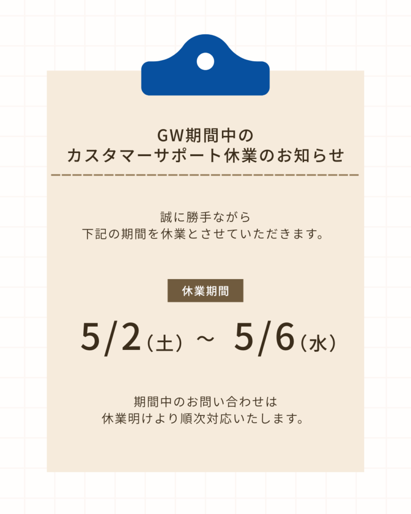 2026年5月1日(金)の15:00以降にお問い合せフォームから頂いたメールにつきましては、2026年5月7日(木)以降の対応とさせていただきます。