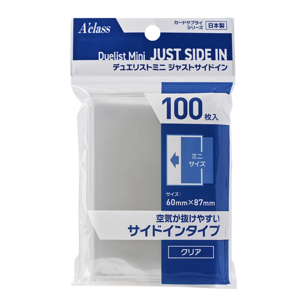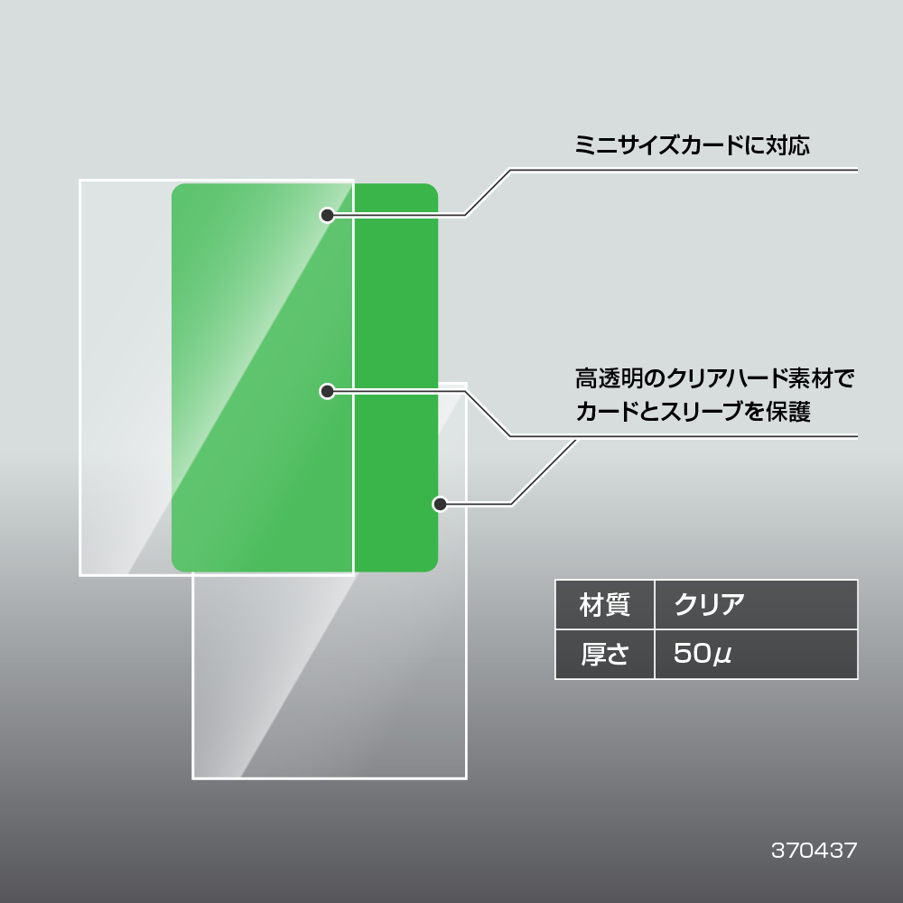 ミニサイズ(59×86mm)のカードがぴったり入る、クリアタイプのスリーブです。他のカラースリーブやキャラクタースリーブと重ねて使用する際にも最適なサイズです。