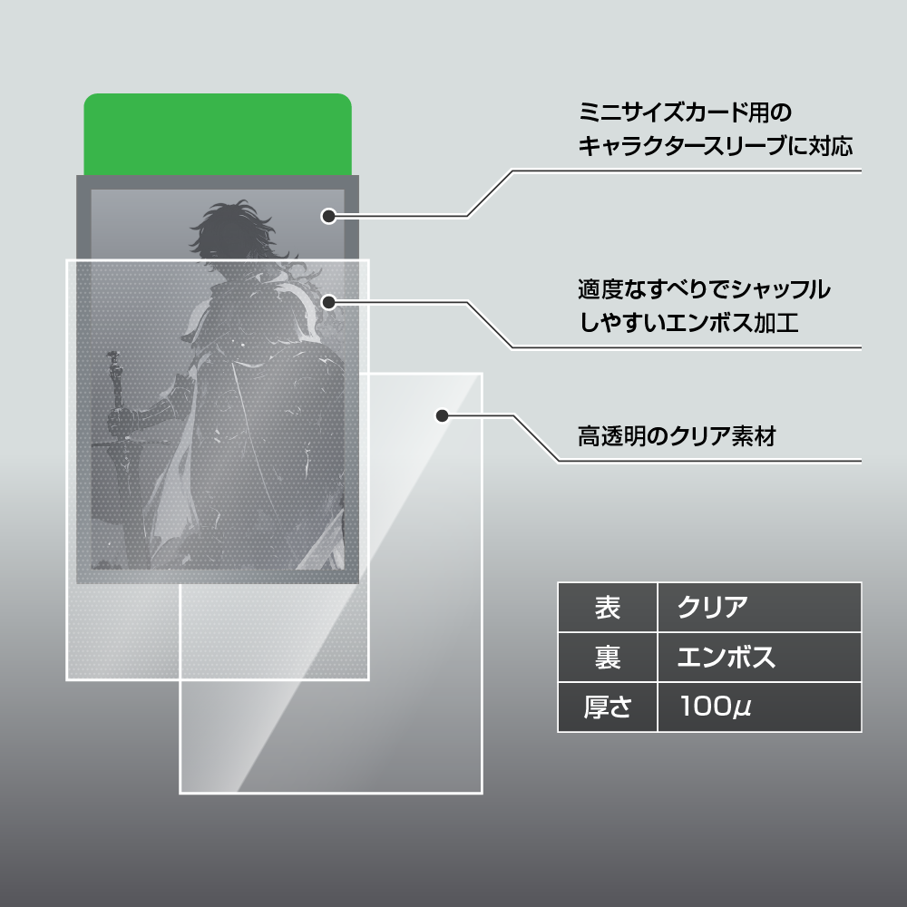 ミニサイズ(59×86mm)用キャラクタースリーブに重ねることができるスリーブで、カードとスリーブを傷や汚れから守ります。