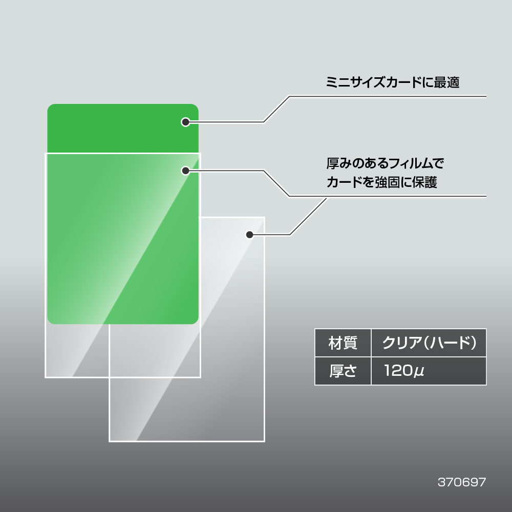 通常のジャストサイズスリーブよりも硬い、厚さ120μのフィルムを採用し、より強固にカードを保護します。