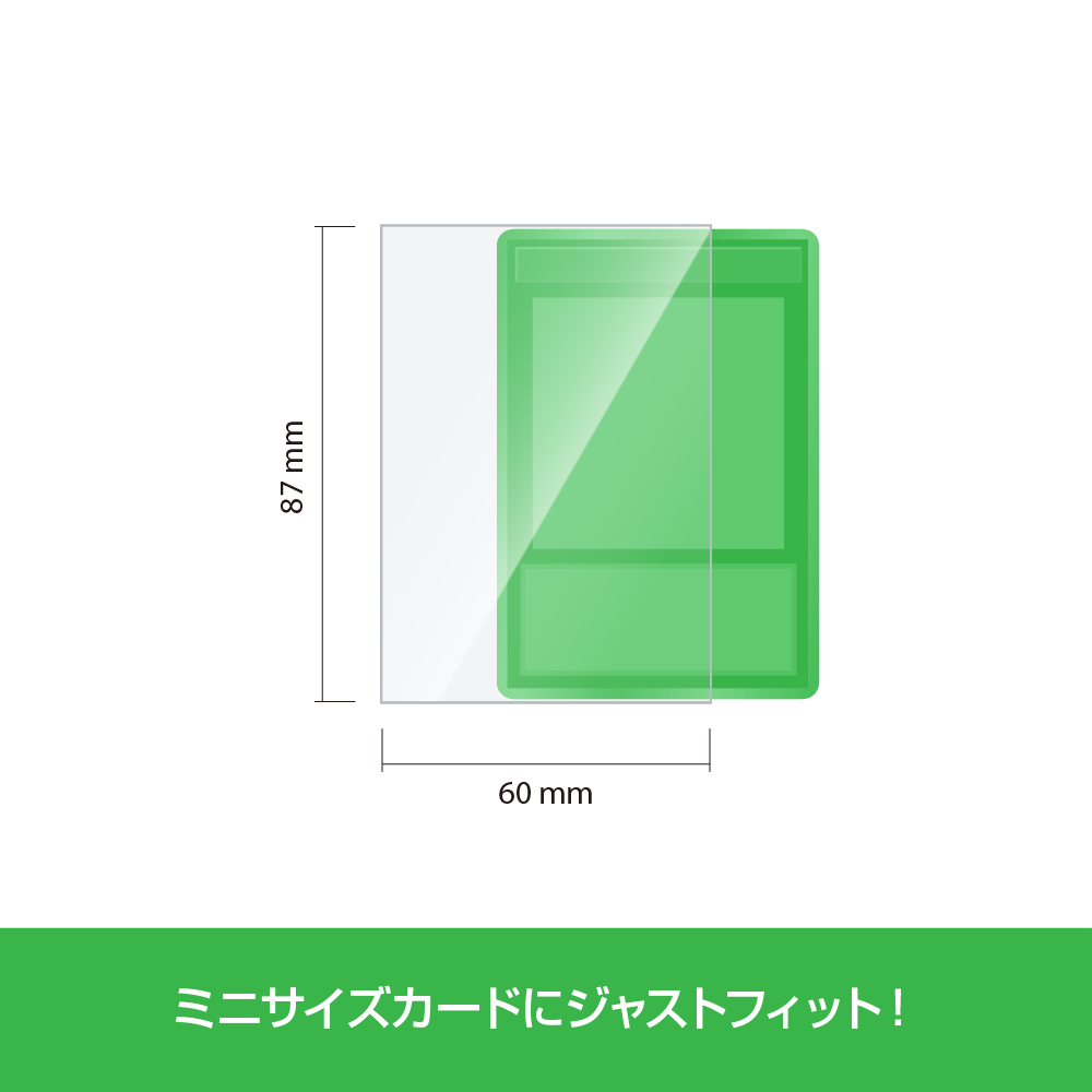ミニサイズ(59×86mm)のカードがぴったり入る、クリアタイプのスリーブです。他のカラースリーブやキャラクタースリーブと重ねて使用する際にも最適なサイズです。