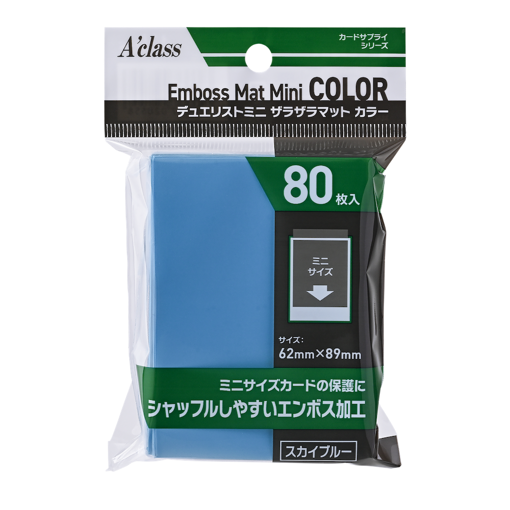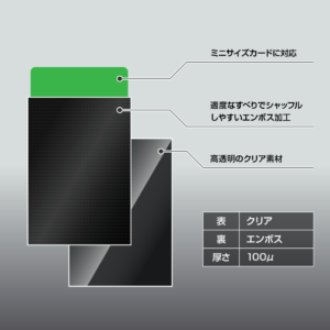 表面はクリア、カラー面には凹凸のエンボス加工を施したフィルムを採用。キズが目立ちにくく、スリーブ同士を重ねた際の適度な滑りと優れた手触りで、ストレスなくシャッフルできます。